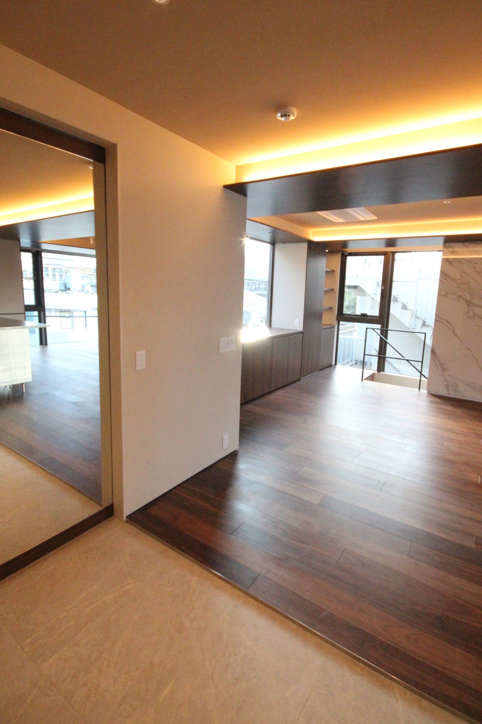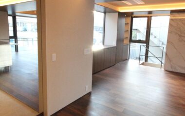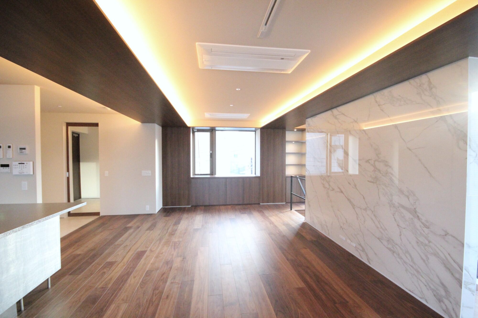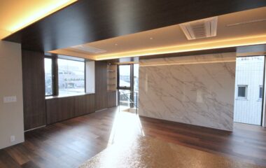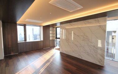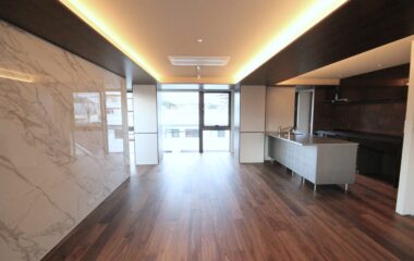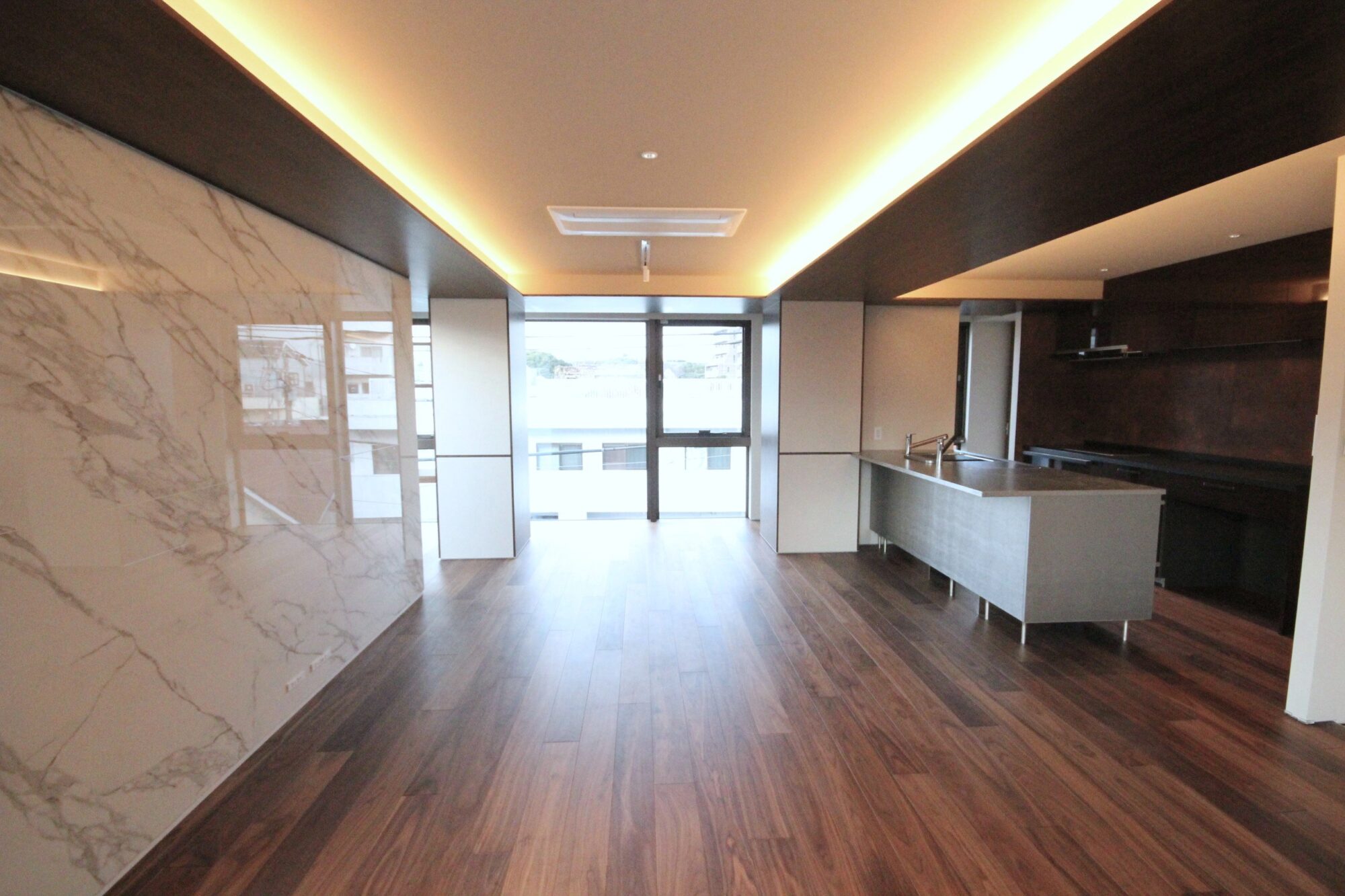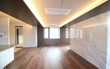 4FのLDKは大判大理石タイルがアクセントの高級感ある内装。
