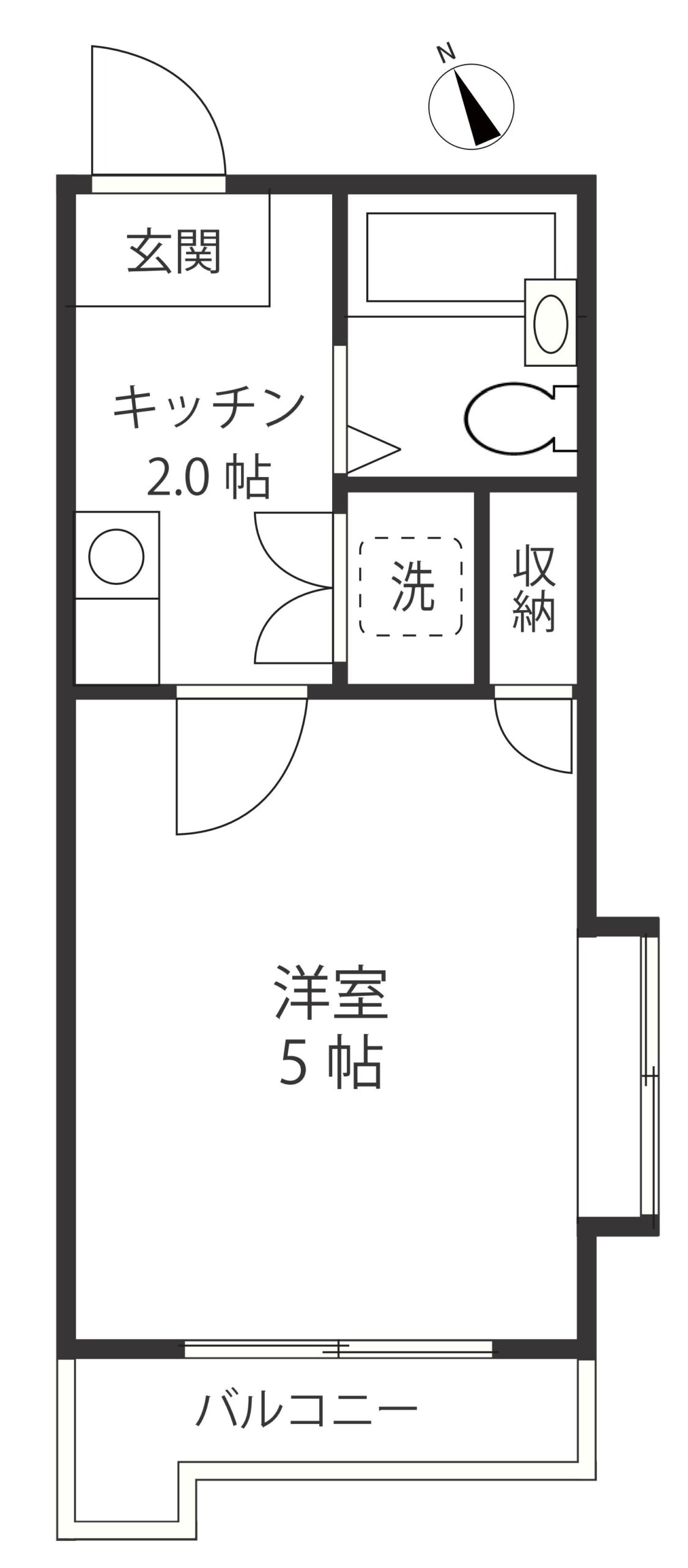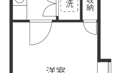 間取りは1K(17.6㎡)。5帖の洋室と2帖のキッチンを備え、コンパクトながらも使い勝手の良い設計で、快適なひとり暮らしを実現します。