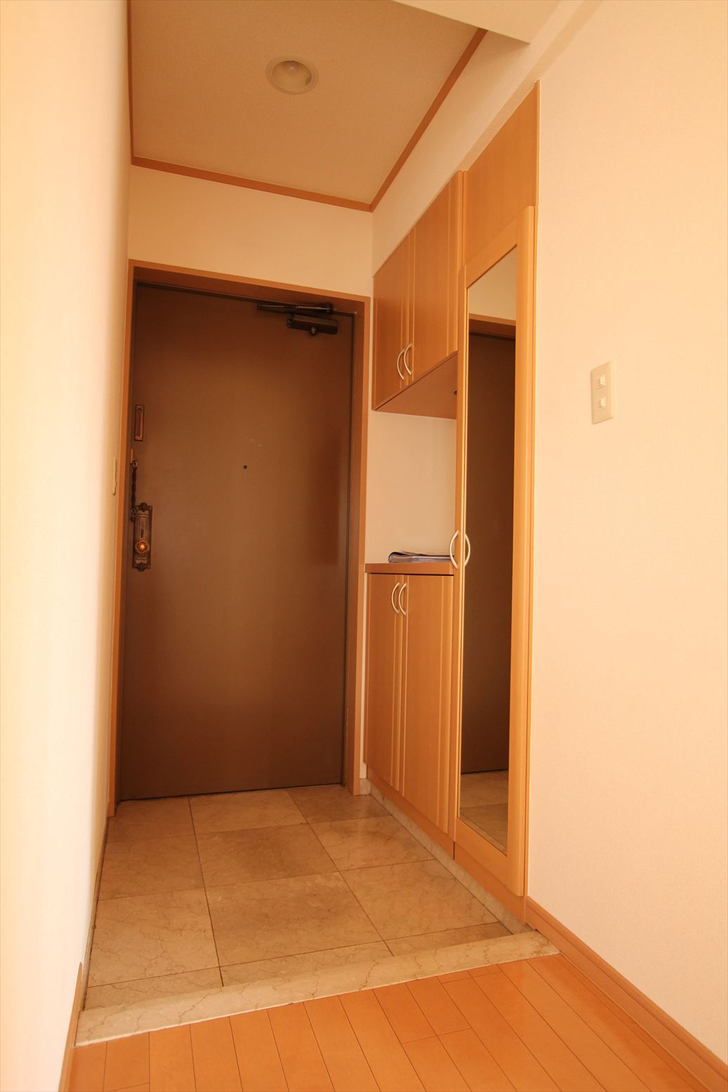 1983年築の重厚なタイル貼りの外観と、木の温もりを感じるエントランスが、落ち着いた暮らしを演出します。